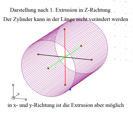 Ich erstelle in 2D eine Kreisfläche, extrudiere diese Kreisfläche in 3 D in die z-Richtung. Die Länge des Zylinders kann ich aber an den grünen Ziehpunkten nicht verändern. Allerdings lässt sich der Umfang des Zylinders in x- und y Richtung verändern. Erst, wenn ich die Ansicht so drehe, dass die y-Achse aus dem Bildschirm guckt und die z-Achse schräg zum linken Bildschirmrand zeigt, erst dann kann ich den Zylinder in der Länge ändern. Kann man das in wenigen Sätzen erklären, warum man nach der 1. Extrusion nicht in z-Richtung den Körper verkürzen kann?